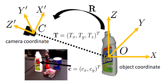 - 2. 각 픽셀의 unit vector를 예측함으로써 물체의 중심을 2D pixel 조정한다. semantic label을 사용함으로써 물체의 중심과 카메라까지의 거리를 예측할 수 있다. 고유의 알고 있는 카메라를 추정함으로써 2D object 중심과 그것의 거리는 3D translation을 알게 해준다.