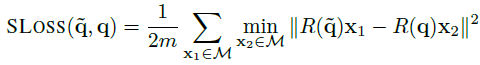 3차원 공간에서 적용을 하고 실제 모델의 point와 예측을 통해 얻은 point의 average squrared distance을 구하기 위해 사용한다. M은 3D model의 point 수이고, R(q~), R(q)는 quaternion으로 계산한 rotation metrics와 ground truth quaternion이다. 이 loss함수는 대칭적인 물체의 경우 제대로 학습이 되지 않아 SLoss를 제안한다.