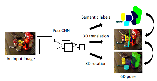 PoseCNN은 이미지에서 물체의 중심을 알아내고 카메라까지의 거리를 예측함으로써 3D translation을 추정하고, quaternion representation을 회귀함으로써 3D rotation을 추정한다.